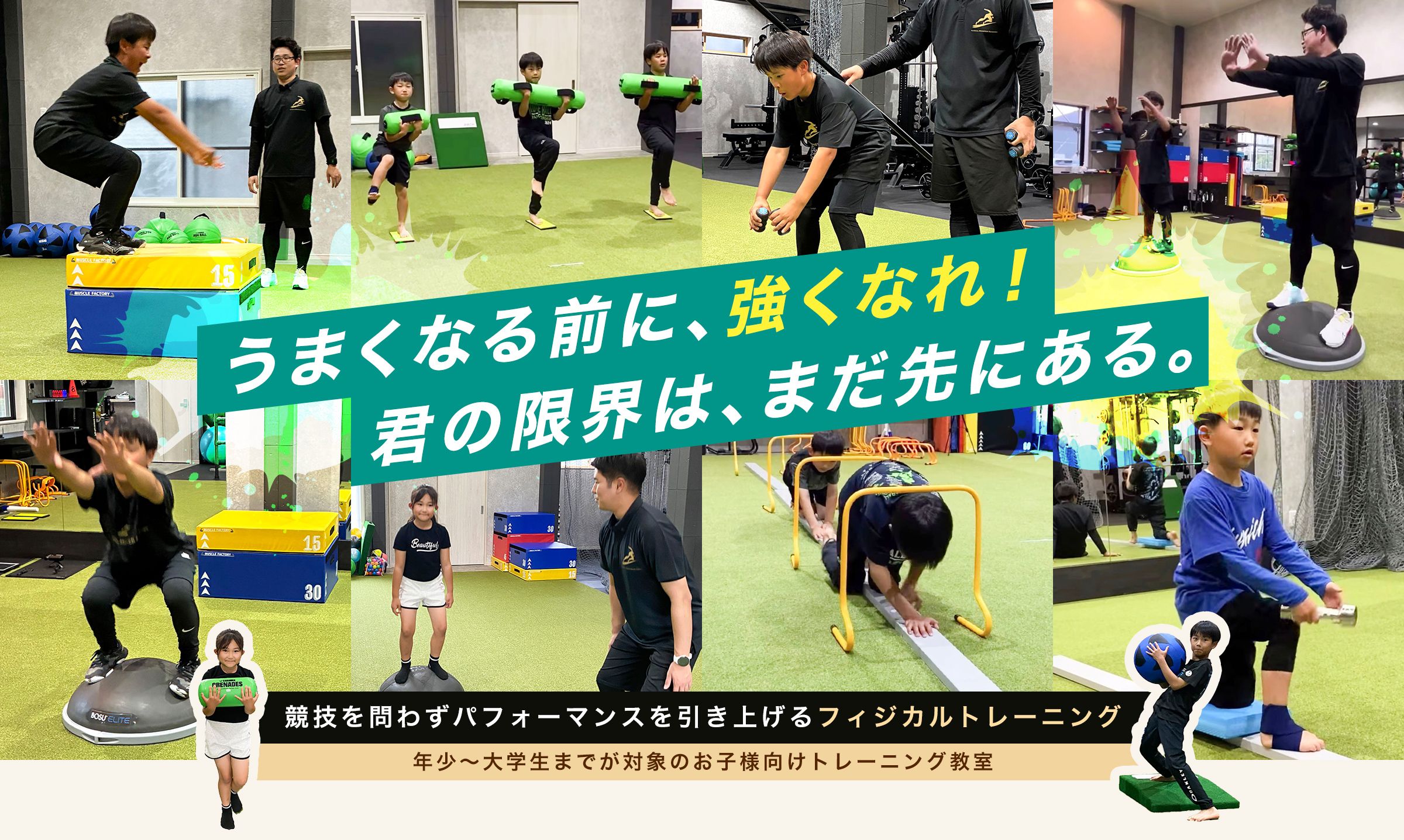 PHYSICAL MONSTER ACADEMY平日15:15~21:30/土曜8:30~12:00スポーツ医科学に基づくS&C専門指導を行う子ども向けジム。NSCA等の有資格トレーナーが少人数制で個別最適化し、ジャンプ測定やVBTなど専用機器で科学的に競技力向上とケガ予防を両立します。トレーニング単価(税込)1,310円/h〜入会金(税込)10,000円〜月会費(税込)-公式サイトを見るプラントレーニング単価(税込)総額(税込)回数時間期間月額制スタンダードコース(小学生1-3年) 月8回¥1,310/h¥10,5008回60分最低1ヶ月他8件のプランを見る
