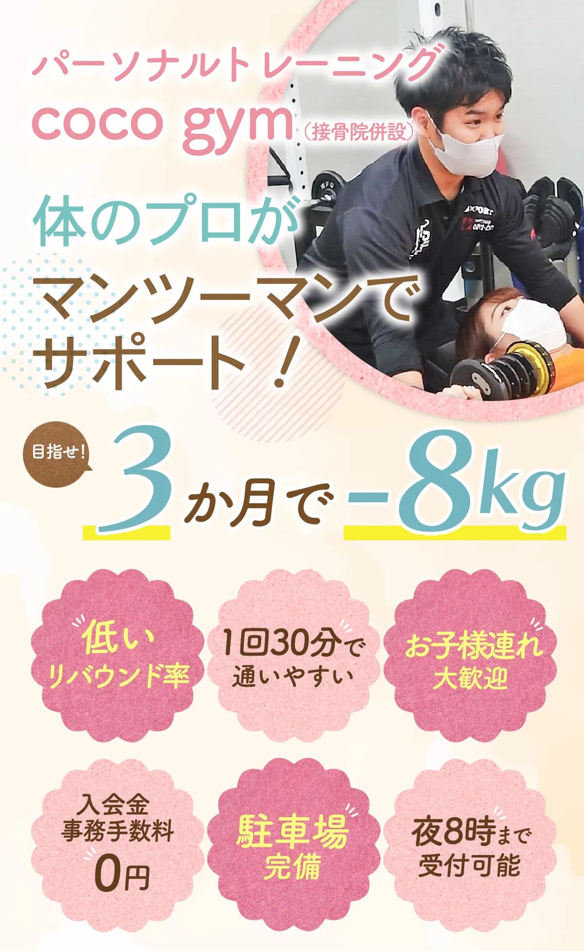 ココジム 海田店平日 9:00~20:00、土祝 9:00~18:00(最終受付:平日20:00、土祝18:00)ココジム海田店は30分~60分の短時間マンツーマン指導と「食べながら痩せる」栄養サポートで無理なく続けられる点が強み。併設の接骨院で不調を並行ケアでき、子連れ対応や駐車場30台完備で通いやすいのも特徴です。トレーニング単価(税込) -入会金(税込)-月会費(税込)-公式サイトを見るプラントレーニング単価(税込)総額(税込)回数時間期間都度払い加圧トレーニング-----他2件のプランを見る