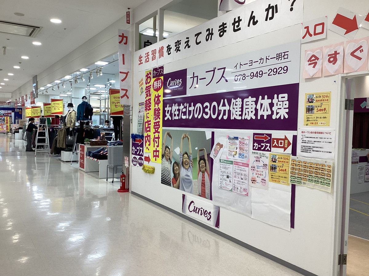 イトーヨーカドー明石店2階にある女性専用カーブス。1回30分・予約不要のプログラムでコーチが見守りながらサポートします。山陽電車西二見駅から徒歩5分で買物ついでに通いやすく、無料体験を実施しています。