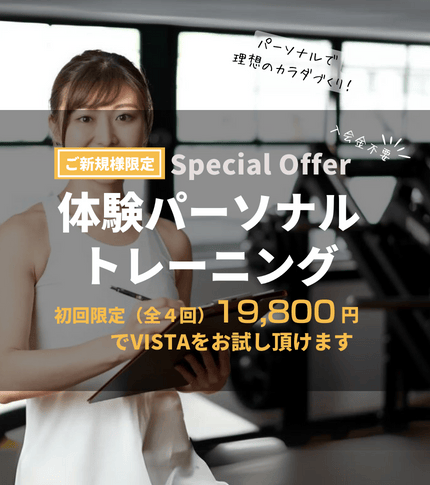 PersonalGym VISTA完全予約制 月~金 9:00〜15:00 18:00〜22:00 / 土日 9:00〜21:00RIZAP出身など経験豊富なトレーナーが在籍。VISTA独自のトレーニングメソッドと毎日の個別食事改善で短期の確実なボディメイクを実現。達成後も定期的なアフターサポートで維持まで支援します。リバウンド対策も含めた継続支援が強みです。トレーニング単価(税込) -入会金(税込)-月会費(税込)-公式サイトを見るプラントレーニング単価(税込)総額(税込)回数時間期間月額制月額-¥5,500--最低1ヶ月他2件のプランを見る