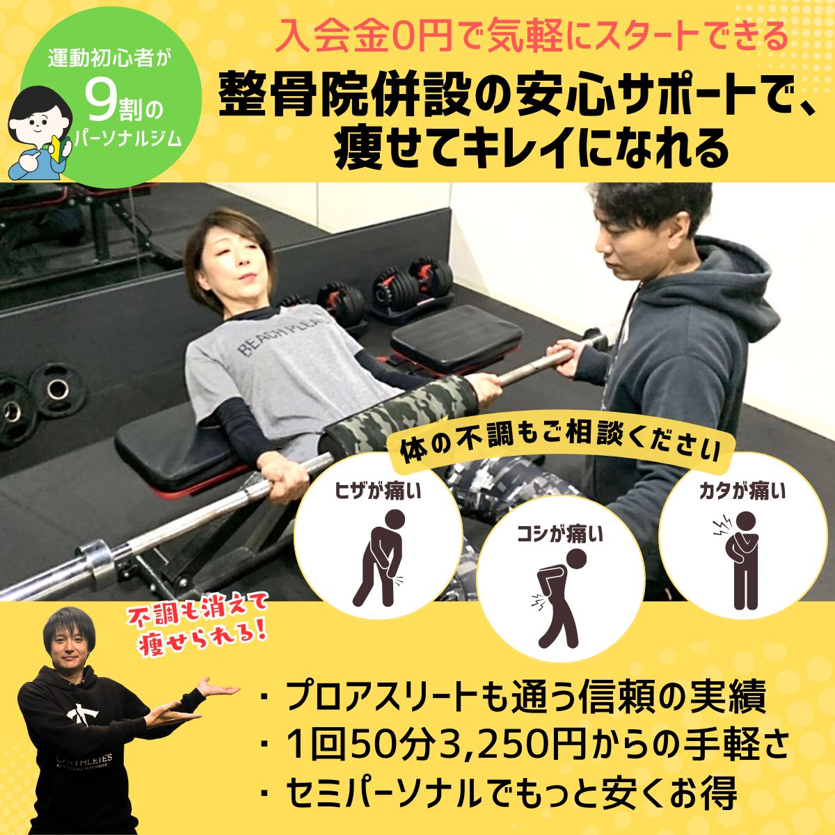 コウジム伊勢田駅から徒歩7分09:00~21:00(月〜金)/09:00~12:00(土)/日曜定休整骨院併設で柔道整復師資格を持つトレーナーが在籍し、痛みや姿勢の改善を含めた医学的根拠のあるオーダーメイド指導を提供。プロ選手の実績を持つ指導で、40代以上や産後の女性も安全にボディメイクと機能改善ができる点が強み。トレーニング単価(税込)3,900円/h〜入会金(税込)無料月会費(税込)-公式サイトを見るプラントレーニング単価(税込)総額(税込)回数時間期間都度払いセミパーソナル1回¥4,800/h¥4,0001回50分-他12件のプランを見る