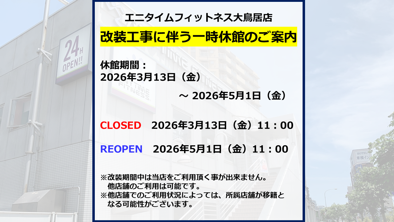 京急大鳥居駅徒歩5分の24時間営業マシン特化型ジム。低価格の月会員制で有酸素〜フリーウエイトまで機材が充実。羽田大鳥居店はシャワー・更衣室を完備し、有料のマンツーマンパーソナルトレーニングを提供。入会手続きはWEBで行います。