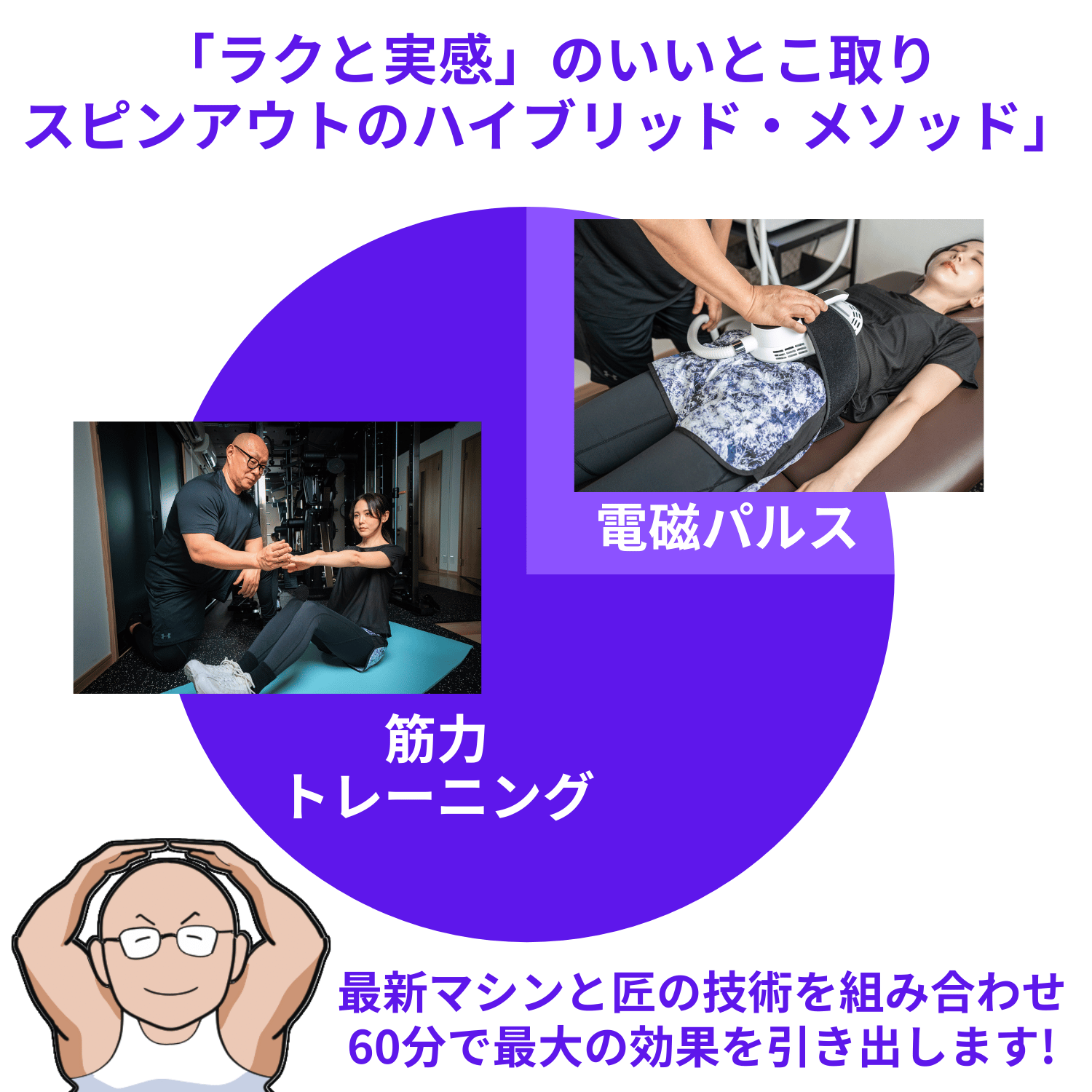 蒲田のプライベートパーソナルジム。電磁パルス(テスラシェイプ)で深層筋を刺激し、前半15分の機器施術と後半45分のマンツーマントレーニングで無理なく体幹・姿勢・ダイエットを支援。完全個室でベテランが40代〜60代を中心に安全に指導します。