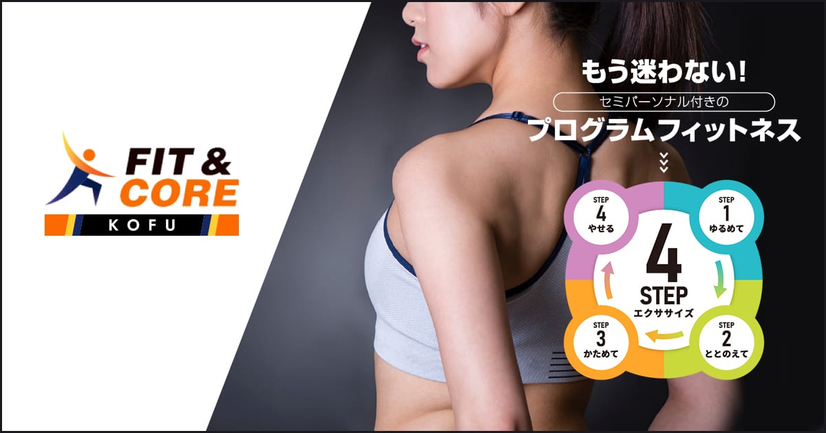 フィットアンドコア 甲府月~木 10:00~21:00(最終受付20:30) 土日・祝 10:00~18:00(最終受付17:30) 12:30~13:30 CLOSE独自の1回60分・4ステップメソッドとBFR(加圧)を組み合わせ、認定トレーナーが個別に指導する成果重視のプログラム。セミパーソナル体制で安心して短期の変化を目指せ、体験後の入会率が約8割と高い点が特徴です。トレーニング単価(税込)2,500円/h〜入会金(税込)無料月会費(税込)-公式サイトを見るプラントレーニング単価(税込)総額(税込)回数時間期間回数券パーソナルトレーニング(会員)8回45分¥3,330/h¥20,0008回45分-他10件のプランを見る