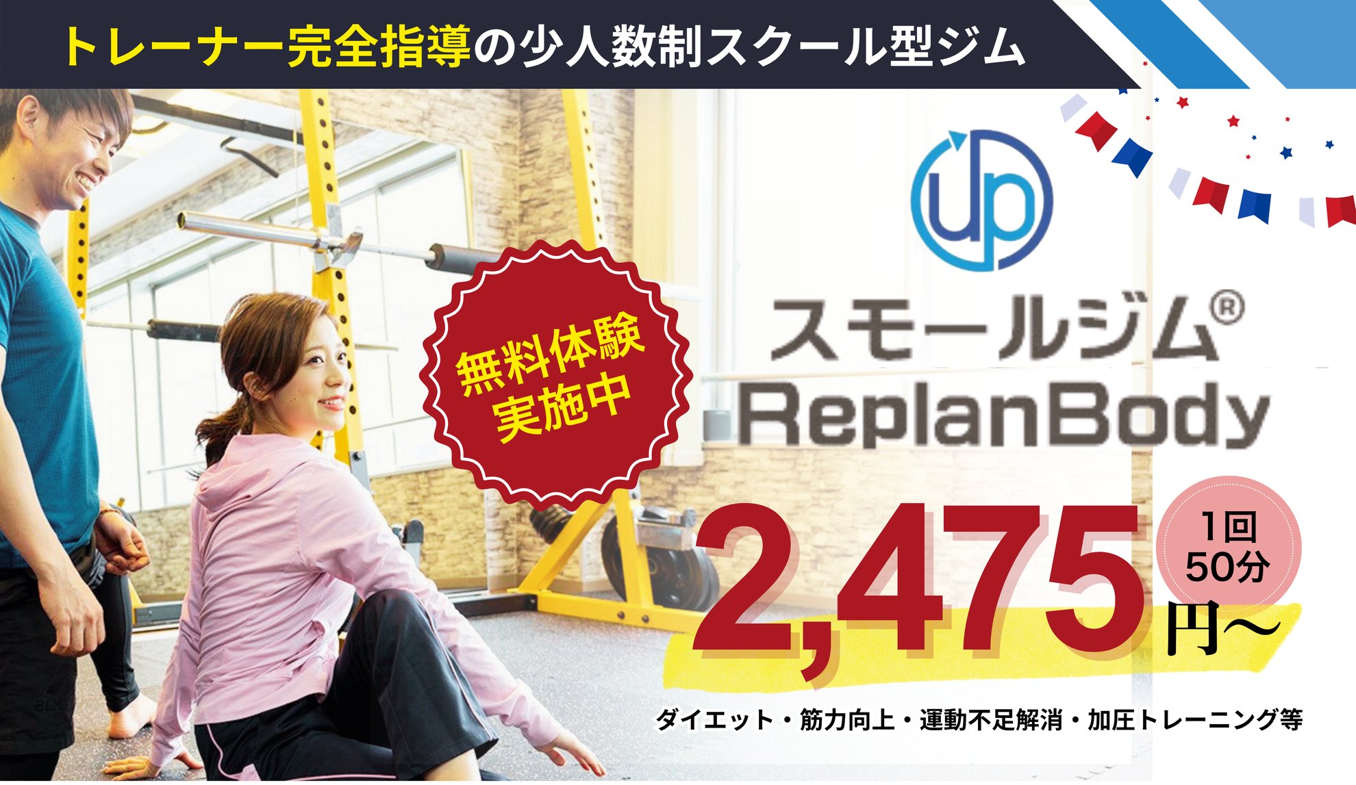 門真市浜町の少人数制ジム。最大3名のスクール形式で毎回トレーナーが完全指導する50分プログラム。週1回から通え、運動・栄養・休養の視点で個別カウンセリングと食事指導を行います。無料体験と60日返金保証、古川橋駅徒歩8分。ロッカーあり。