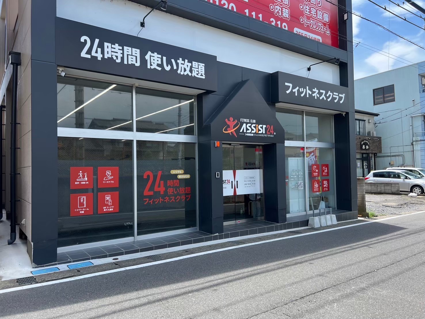 春日部市のアシスト24南桜井駅前店。24時間利用可能でシャワー・ロッカー完備、スタッフ常勤時間に利用説明や無料体験を受けられ、スタンダード会員は他店舗利用も可能です。低価格の月額制で学生・シルバー向けコースも用意しています。