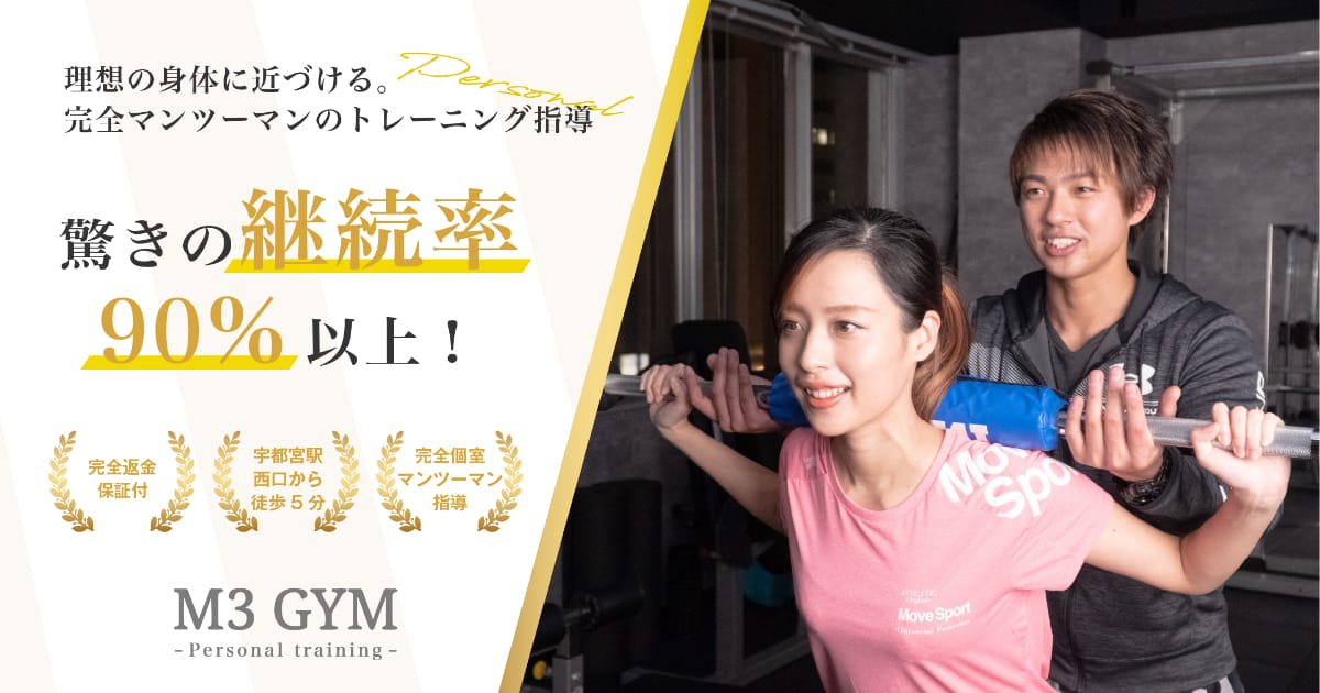 M3 GYM宇都宮駅から徒歩5分M3 GYMは宇都宮駅徒歩5分の完全個室マンツーマンジムです。経験豊富なトレーナーが食事管理を含む個別指導で目標達成をサポートし、継続率90%・都度払いで無理なく通えます。充実のトレーニング機器と10kgバーベルで初心者も安心、筋力増強やスポーツパフォーマンス向上にも対応。トレーニング単価(税込)6,000円/h〜入会金(税込)15,000円〜月会費(税込)-公式サイトを見るプラントレーニング単価(税込)総額(税込)回数時間期間都度払いパーソナルトレーニング¥6,000/h¥6,0001回60分-他1件のプランを見る