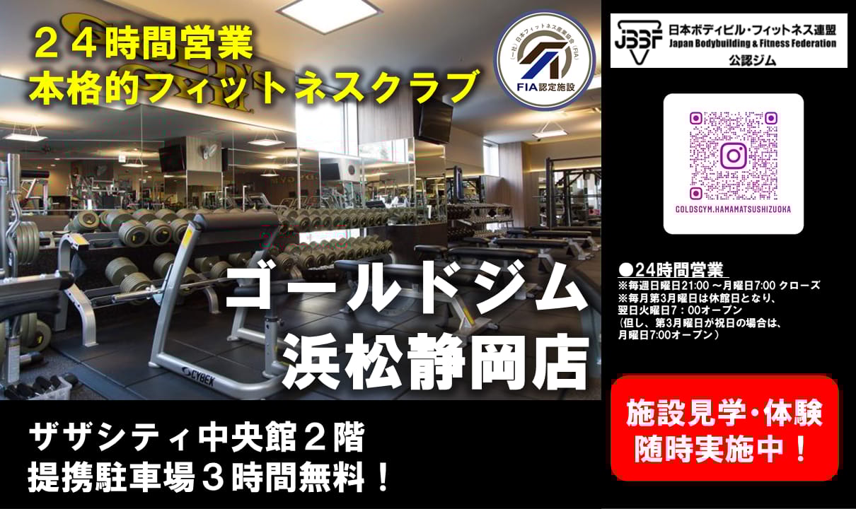 GOLD'S GYM 浜松静岡浜松駅から徒歩5分24時間営業(毎週日曜21:00〜月曜7:00クローズ、毎月第3月曜休館)ZAZACITY浜松中央館にある24時間営業のゴールドジム。会員以外も利用できるプロショップを備え、無料のトレーニングサポートや、資格あるトレーナーによる60分のマンツーマン指導(加圧含む)など個別サポートが充実。トレーニング単価(税込) -入会金(税込)-月会費(税込)-公式サイトを見るプラントレーニング単価(税込)総額(税込)回数時間期間都度払い加圧サイクルトレーニング-----他1件のプランを見る