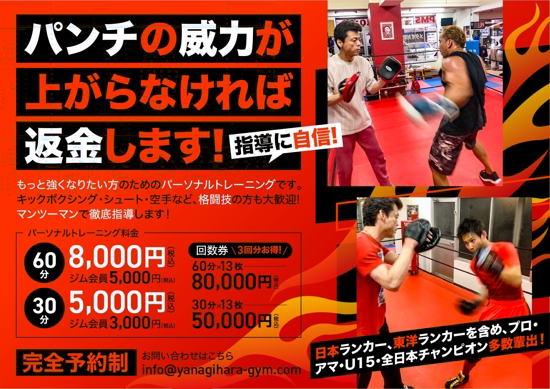 YANAGIHARA GYM小倉駅から徒歩6分月曜日~金曜日:11:00~21:00 土曜日:11:00~20:00 定休日:日曜日・祝日・その他試合開催日等プロ・アマ選手育成から一般・キッズまで対応する小倉のボクシングジム。現役スタッフによる個別指導でパンチ力向上やダイエットを支援し、リングやサンドバッグ等のプロ仕様設備で本格トレーニングが可能です。トレーニング単価(税込) -入会金(税込)5,500円〜月会費(税込)-公式サイトを見るプラントレーニング単価(税込)総額(税込)回数時間期間月額制一般女性-¥8,800--最低1ヶ月他10件のプランを見る