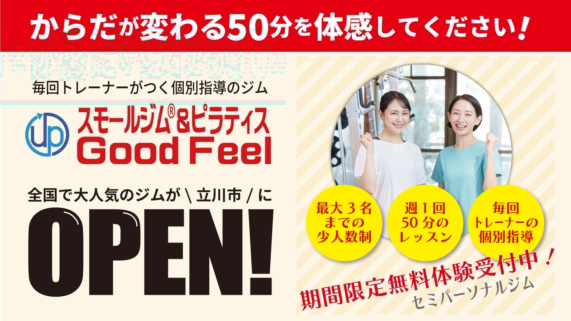 整骨院監修で柔道整復師ら国家資格者が在籍。入会金ゼロの都度払いで、マンツーマンから最大4名のセミパーソナル、整体技術と食事・セルフケアを一貫サポート。ベビーカー・ペット同伴OKの地域密着型ジム。