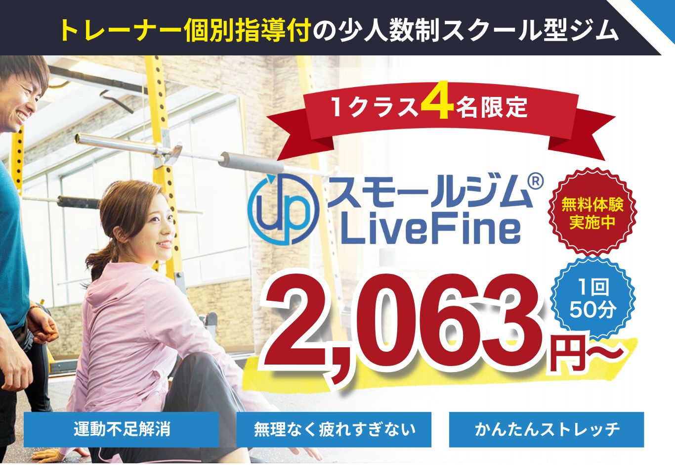 パーソナルトレーニングがずっと無料で受けられる北九州市小倉北区の個人経営ジム。有酸素ルームとトレーニングルームを完全分離し、初心者にも丁寧な個別指導を実施。入会後最低2ヶ月は手厚くサポートし、女性も安心して通える環境です。