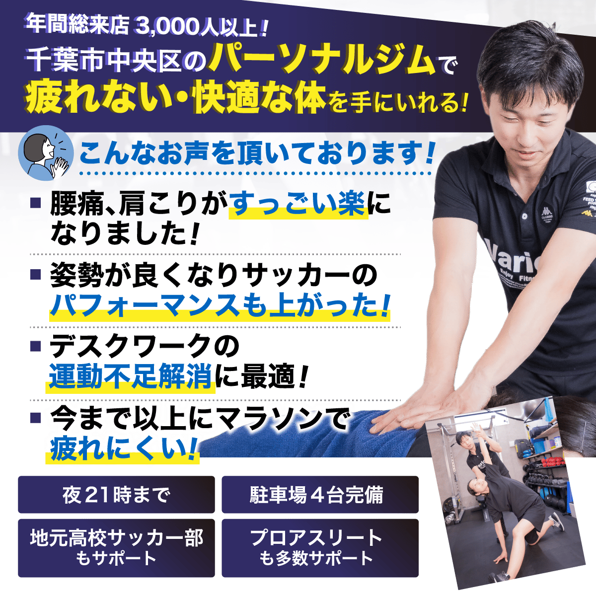 | 概要 | ハーバーシティ蘇我内にあるティップネス蘇我は、24時間利用可能なジムに加え蘇我エリア最大級の25Mプール、50名収容の大型スタジオ2面と充実のリラクゼーション設備、無料駐車場を備え、トレーニングと回復を一カ所で完結できる点が強みです。 |